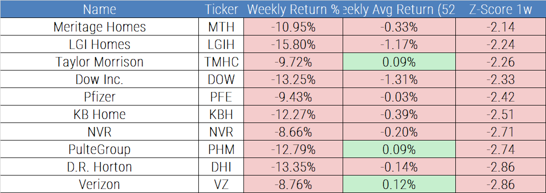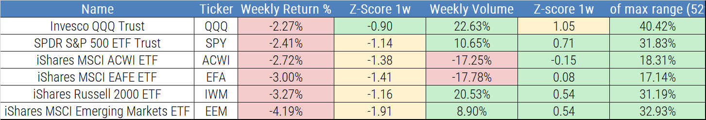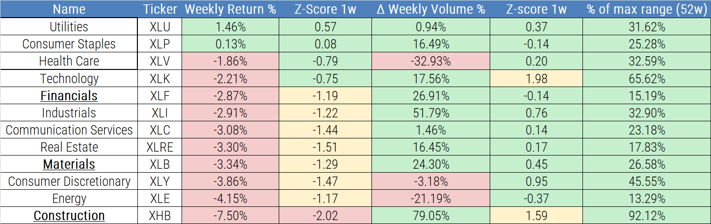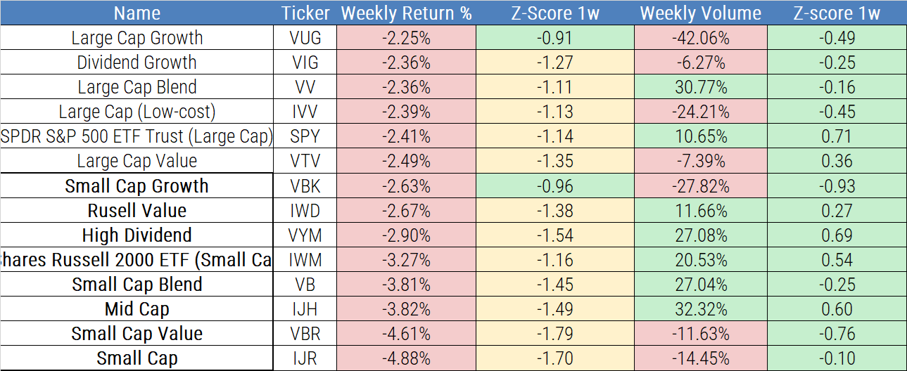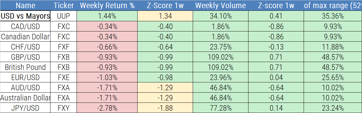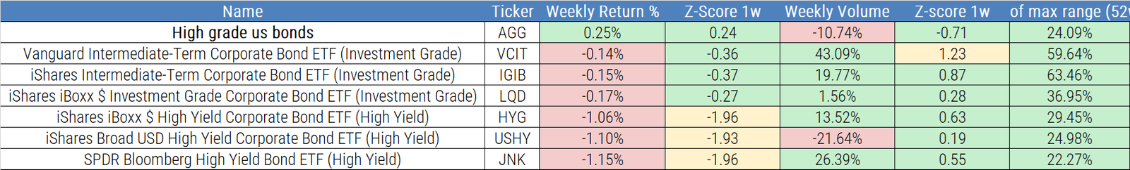 However, the goal of these tables isn’t to track direction, but to measure intensity — that’s what the Z-score captures. Look at the intensity of the moves in high yield — all clustered around 2, which, as we know, signals an extremely strong move. In fact, the difference is so small that it only shows up in the cell color — they’re right at the limit, following a traffic-light logic.
