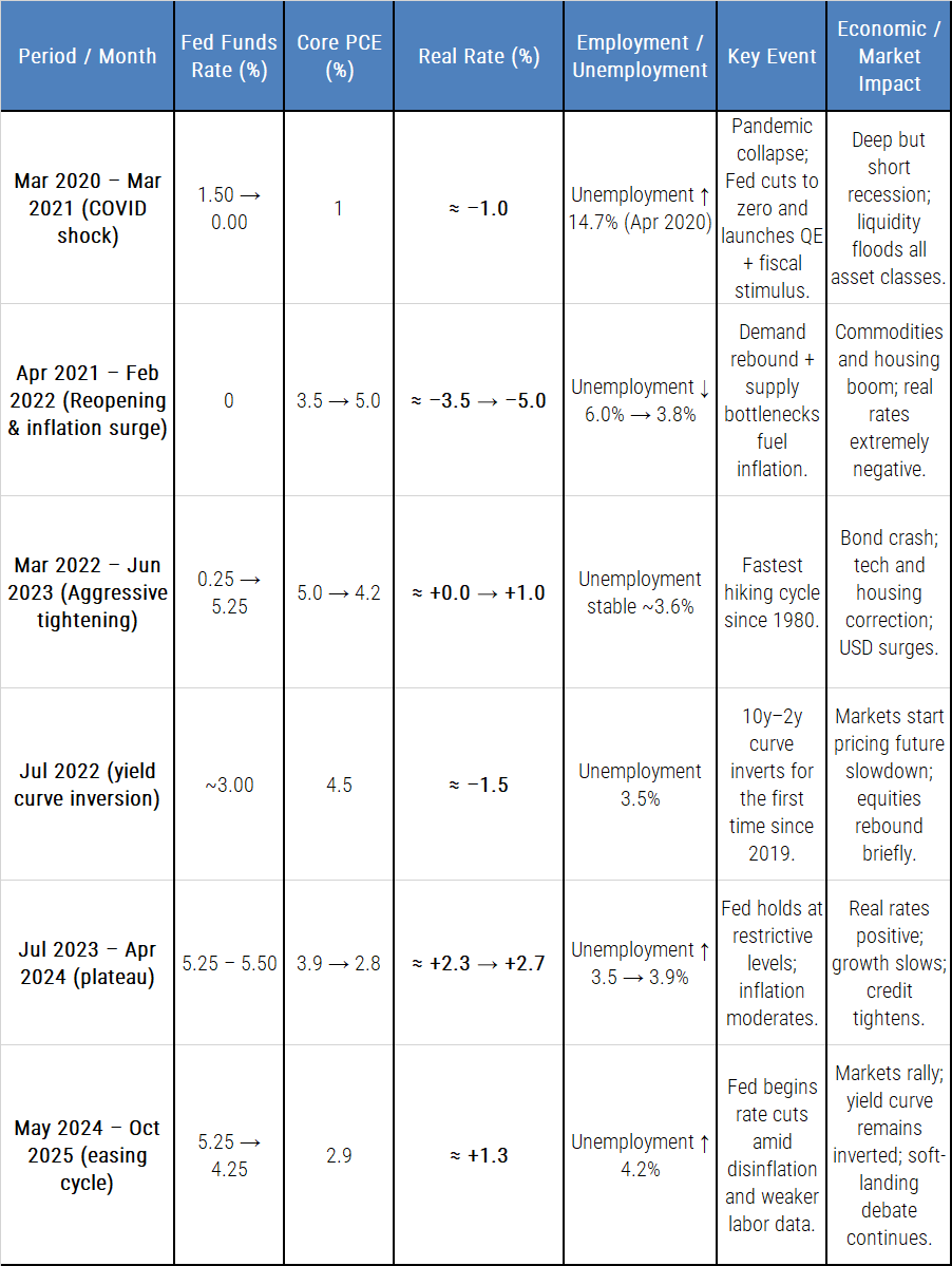 - Fast rate adjustment: The tightening cycle was quick, not gradual, again echoing the dot-com pattern.