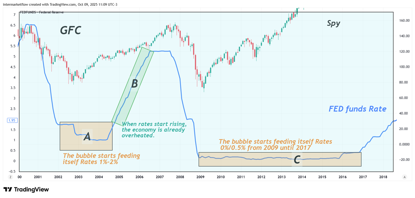- Bubble core: This time centered on housing, financed by massive, cheap credit and a broken or nonexistent credit-scoring system. Rates were low, and profits came from volume — much like the speculative momentum in tech during 2000.