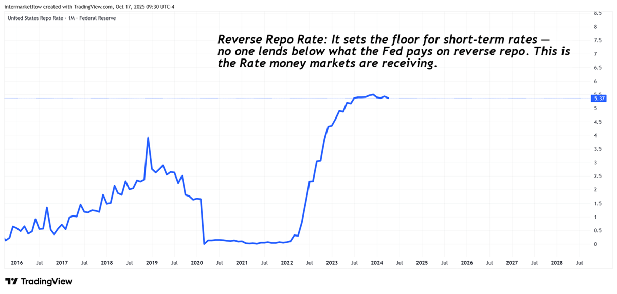 Created after the GFC, this market grew massively during the QE years, when excess liquidity pushed short-term rates lower. To contain it, the Fed created this “bucket” — a place for excess cash to park.
