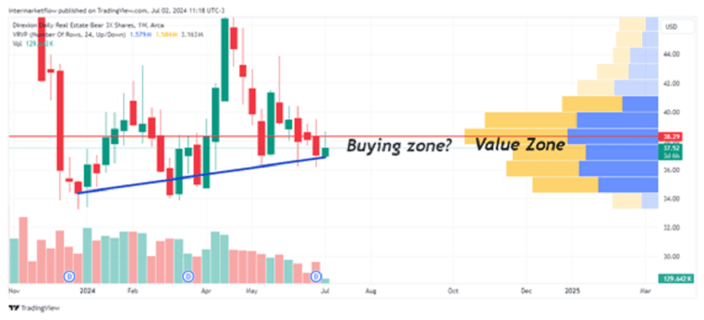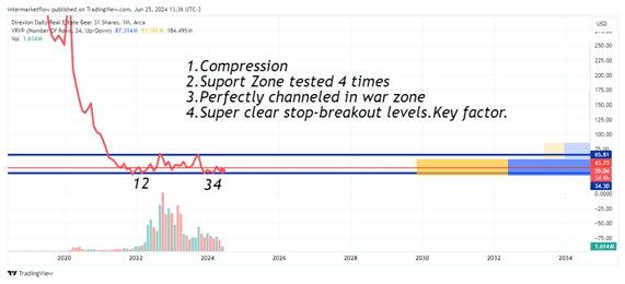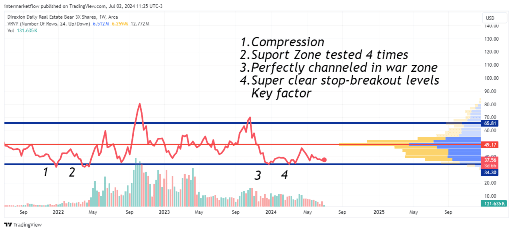 Breaking down the time into weekly frequency and observing only the closes, we see a completely channeled asset. The battle zones, value zones and breakout points are super clear. This is very important for us. We know where we’ve lost. It determines the position size, given the asset’s volatility. Remember, DRV x 3. Another important dimension is analyzing the market’s stance on value. It’s very concentrated. The paths of least resistance are longer paths.